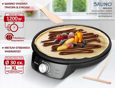 BRUNO BRN-0252 Κρεπιέρα 30εκ. 1200W με ρυθμιζόμενο θερμοστάτη και εξαρτήματα, μαύρη